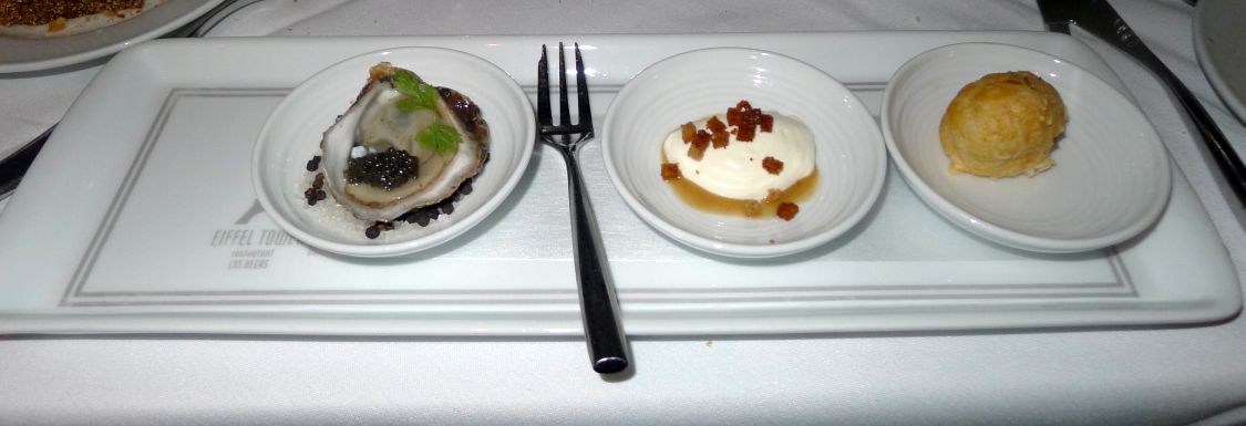 The next course is a trio of amuse bouche: oyster with caviar, burrata with crispy serrano ham, and gougère with foie gras mousse.