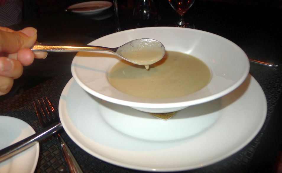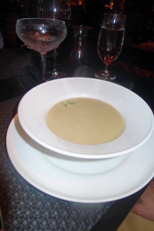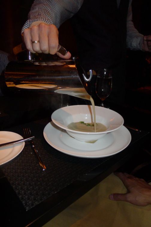 Hoa selected the creamy potato and artichoke soup with marinated Pearl onion, Mache and Lemon