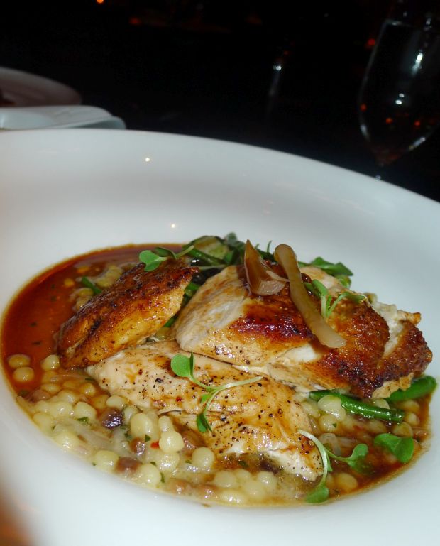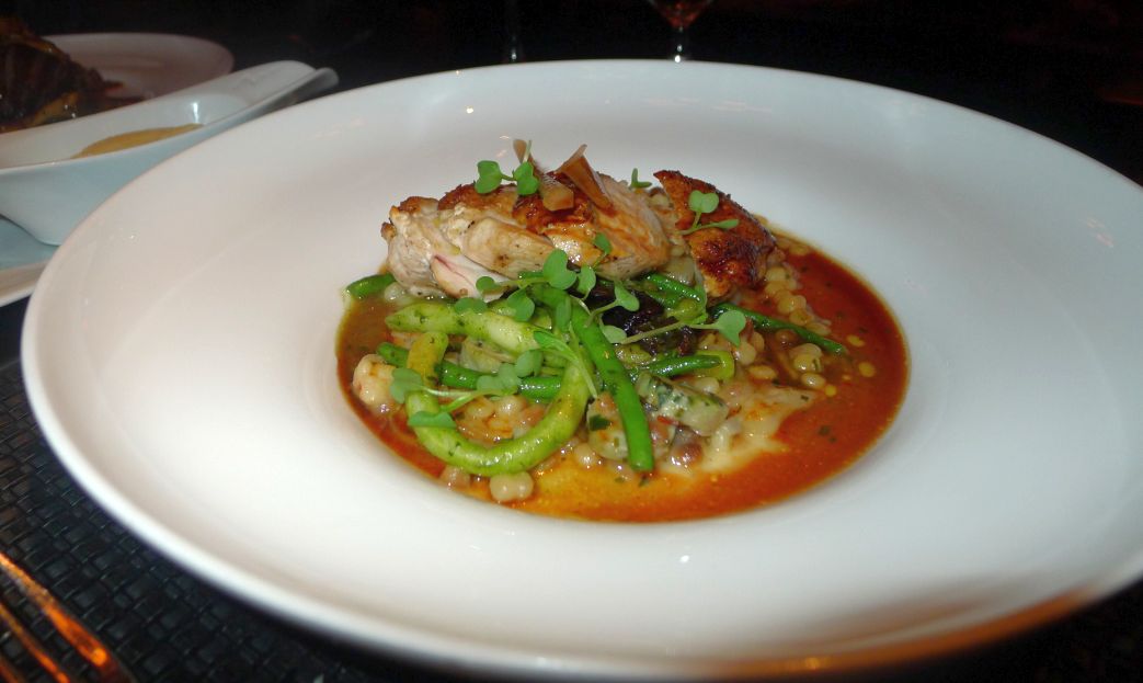 Hoa selected the Shelton's farm organic Chicken with Farmhouse sausage, creamy fregola, Alfafa hay smoke.