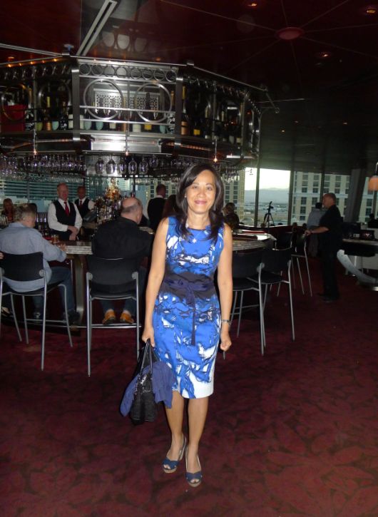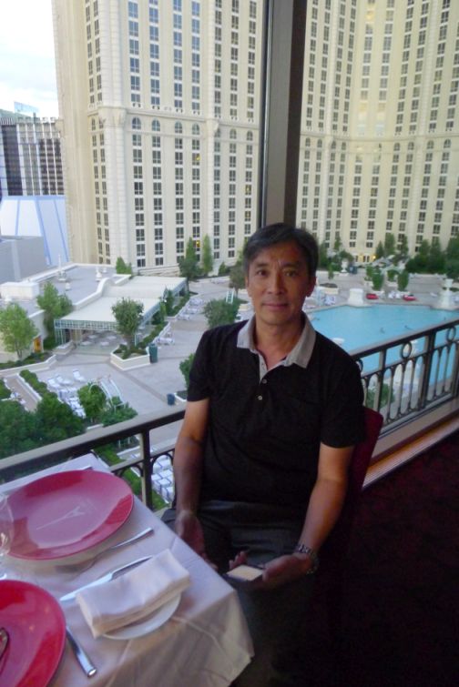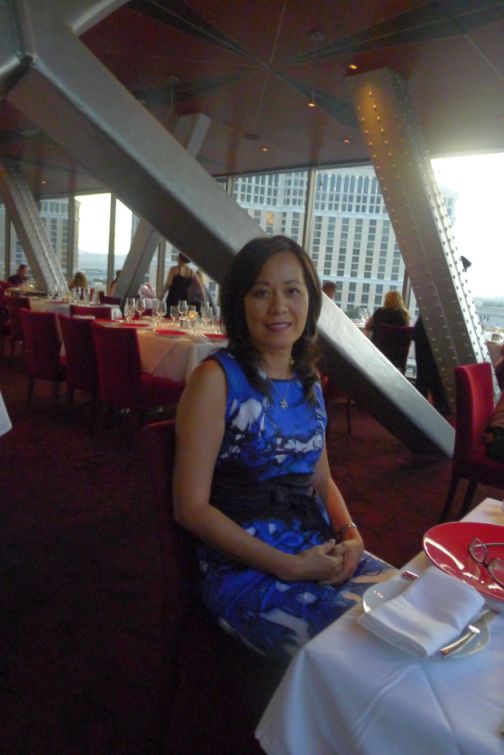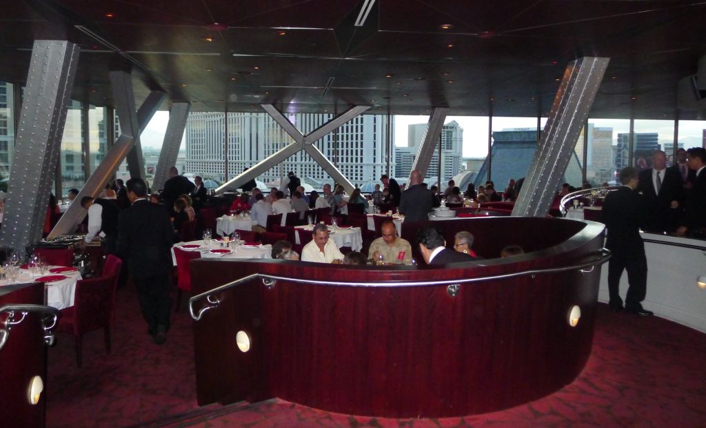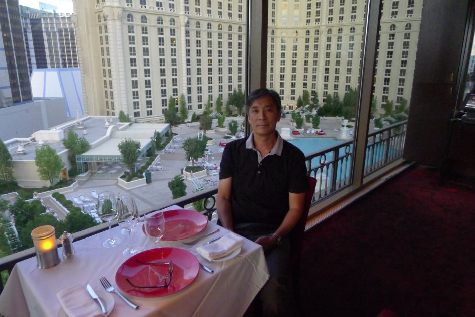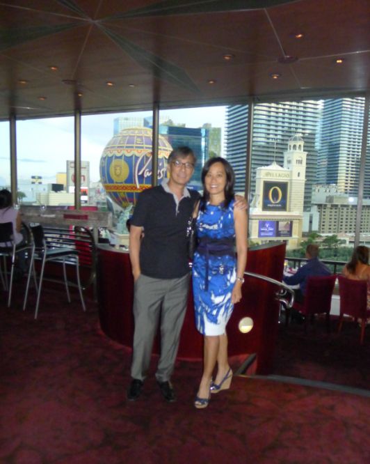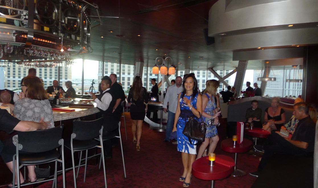 Hoa and I waiting close by the bar. Panoramic views of the Las Vegas strip can be seen.