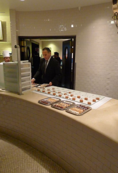 On the left hand side of the kitchen is an area where Amuse bouche (gazpacho) and trays of Mignardises are set up before being served. |