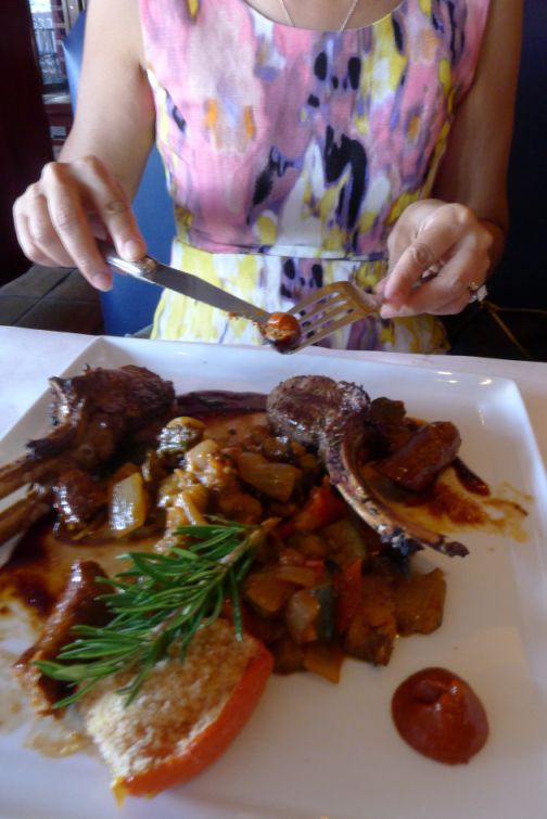 I ordered a LAMB MIX, two grilled lamb chop and one Merguez (a spicy sausage from North Africa) sausage served on a bed of mashed potatoes and ratatouille