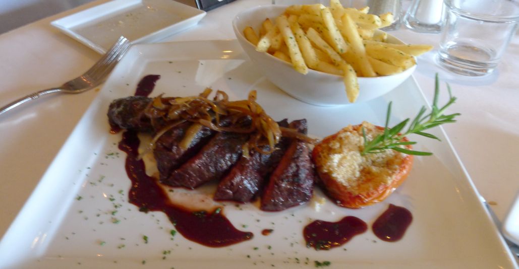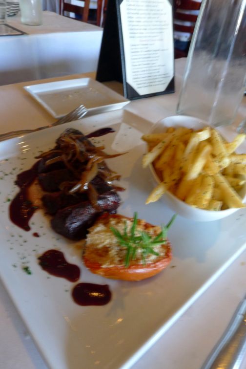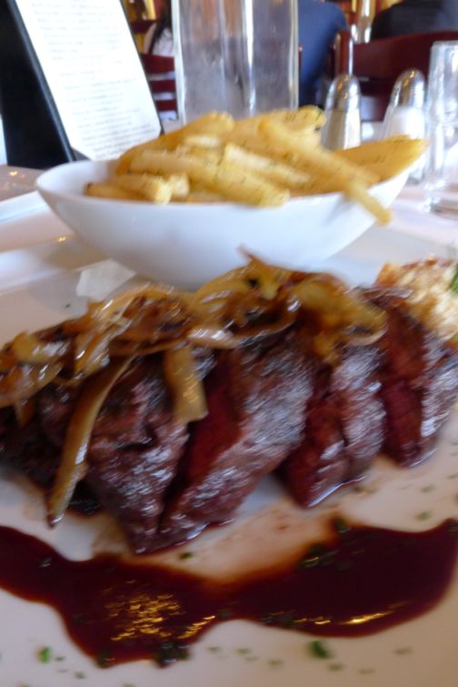 Kevin ordered a STEAK FRITES, grilled Niman Ranch hanger steak with shallots, red wine reduction and pommes frites.
