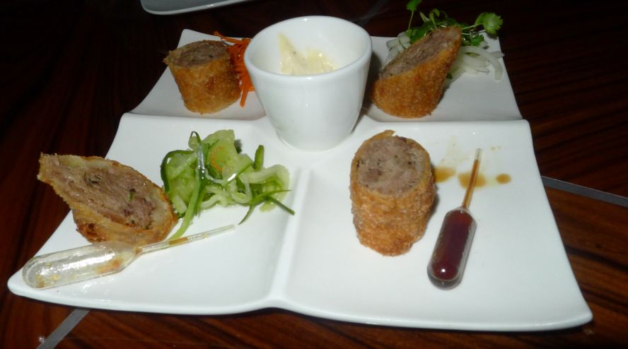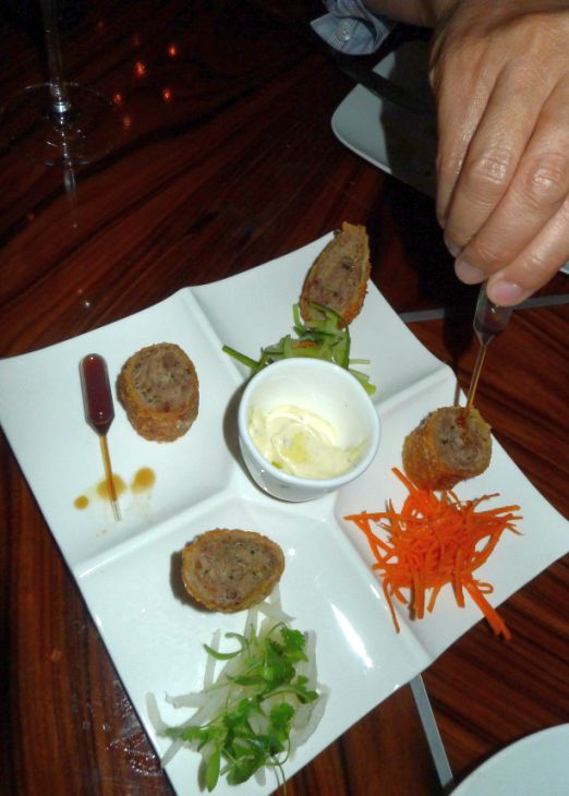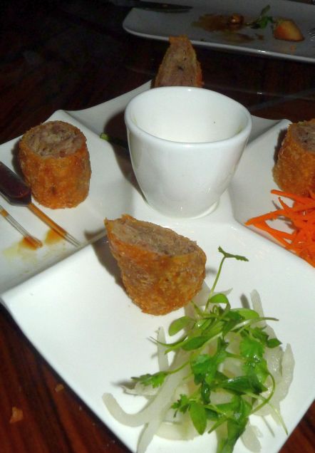 Hoa and I we were a bit surprised when this dish came out! I did not expect the duck confit to be served as roll . This dish is definitely a fusion between French and Vietnamese. The duck confit meat is rolled up and then fried and served with pickle daikon and carrots (Vietnamese style) and a bit of truffle injection and truffle aioli (French).