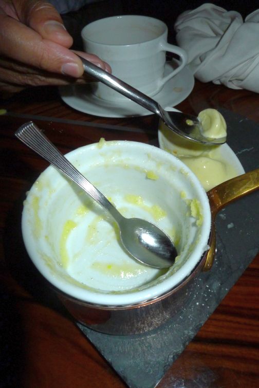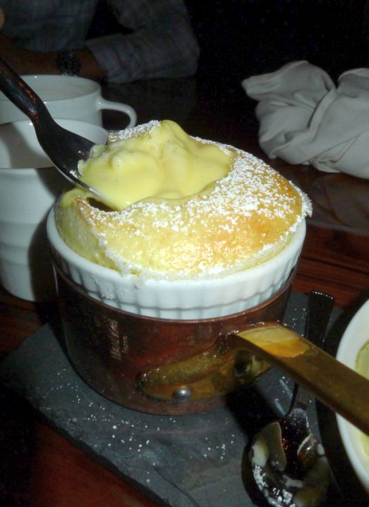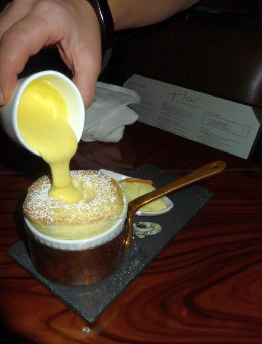 The waitress is pouring the crème Anglaise on top of the soufflé. |