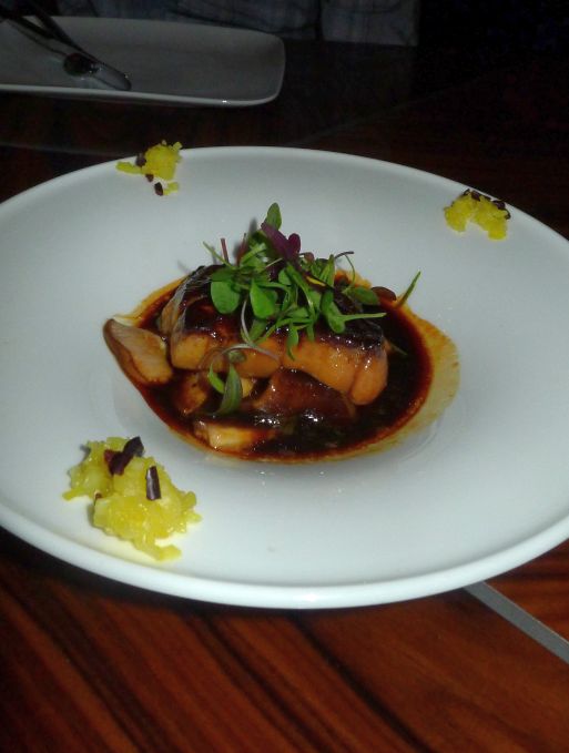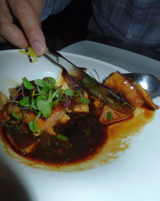 with pickled shiitake, pineapple, cocoa nib, with a port wine-ginger reduction.