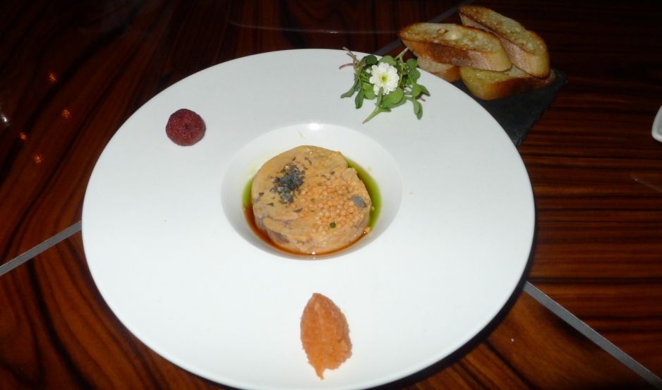Monkfish liver cooked au torchon topped with rice crunch and iridescent mint soy, and Hawaiian salt.