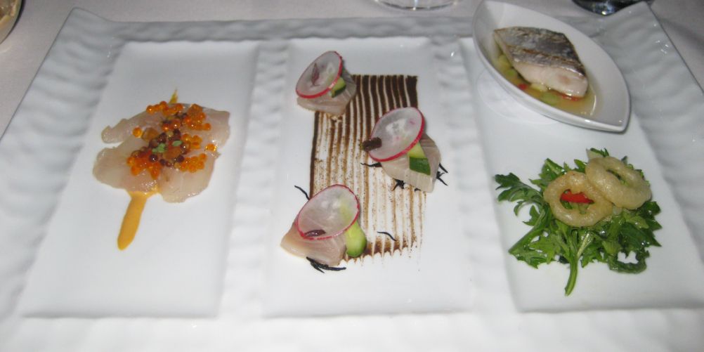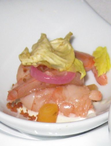 I can't remember what he said about this dish but it is basically poached shrimps with with vegetable and fish row. It was very refreshing and good too. |