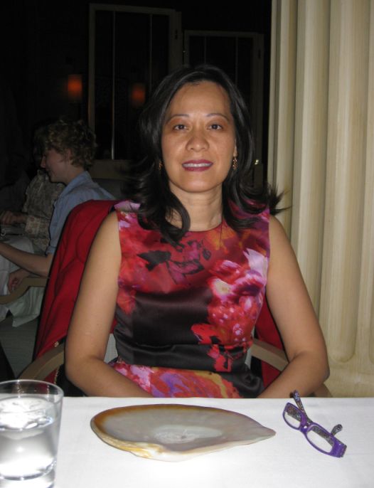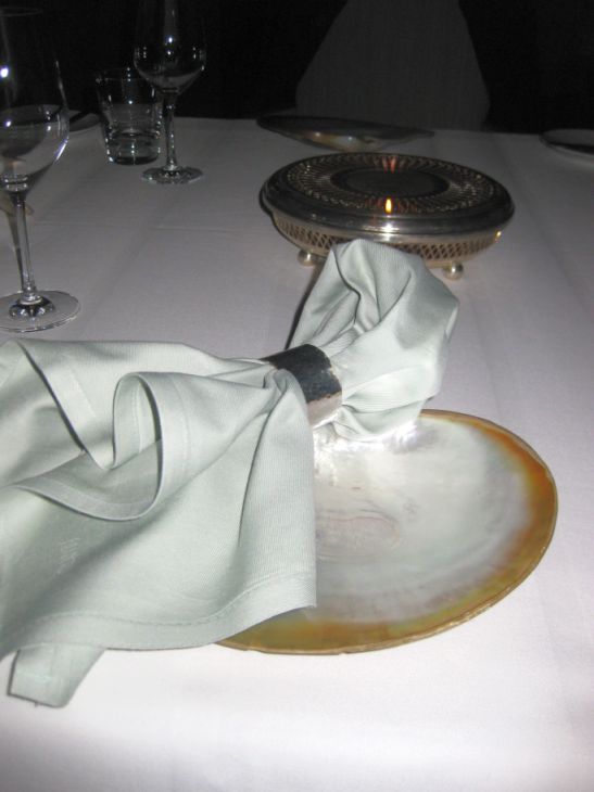 Small touches at the table are appreciated. The lighted silver trivet cast a warm glow on the table. Oversize napkin is set on top of a giant Indonesian oyster shell. |