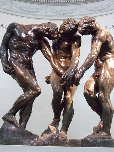 The Three Shades by Auguste Rodin, 1880 Bronze The Three Shades stand atop The Gates of Hell, gesturing downwards, heads lowered and arms extended, appearing despondent and weary. The composition consists of three casts of the same figure juxtaposed at slightly different angles. Rodin's peers believed The Three Shades signified Dante's warning, "Abandon every hope, ye who enters here," which is taken from the inscription above the Gates of Hell in Dante's Inferno |