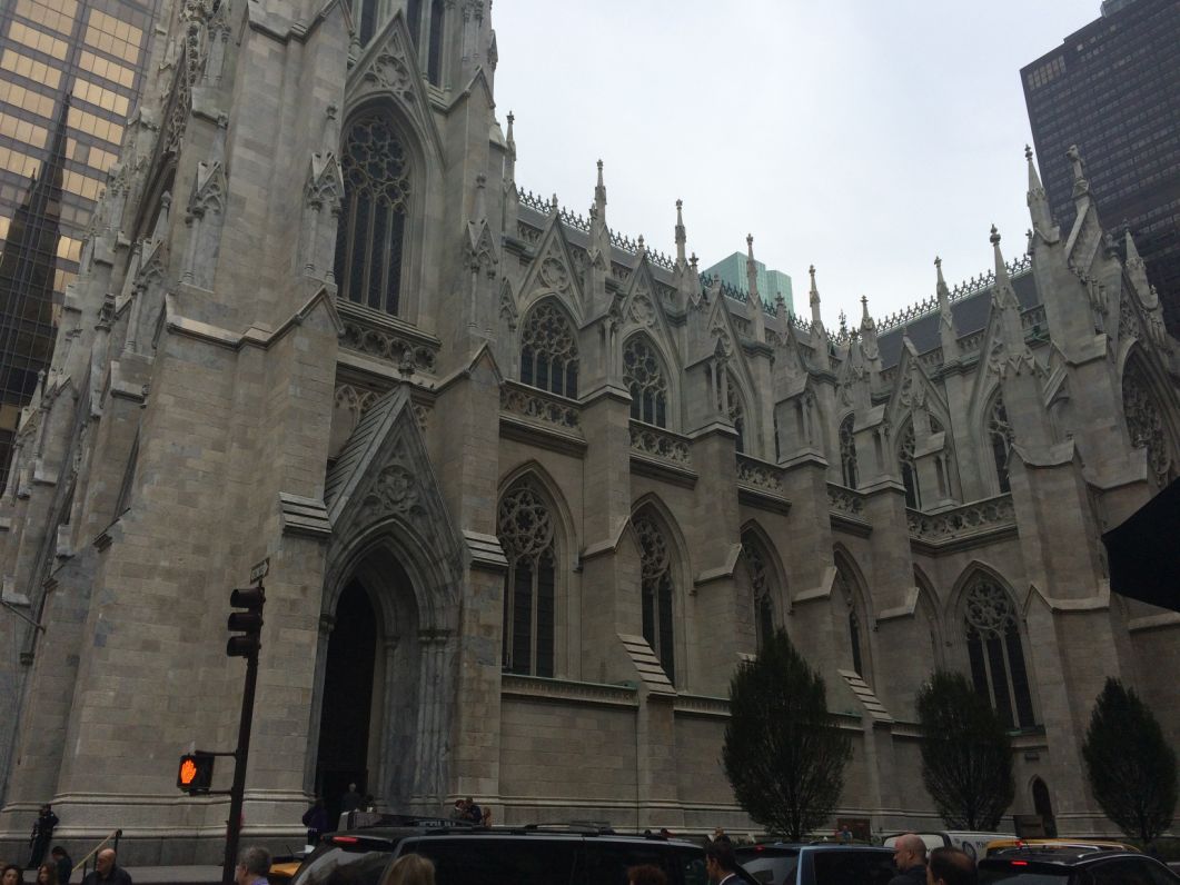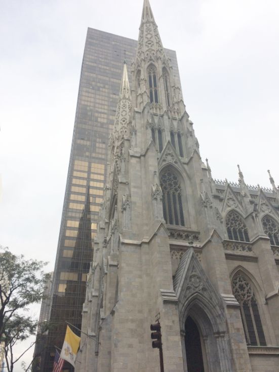 building has to steeples with rise 100 meters from the sidewalk and the roof is
