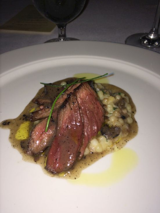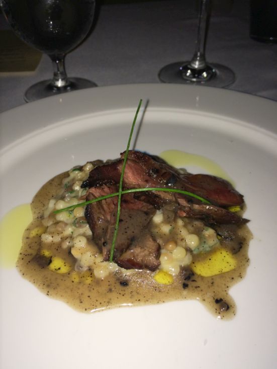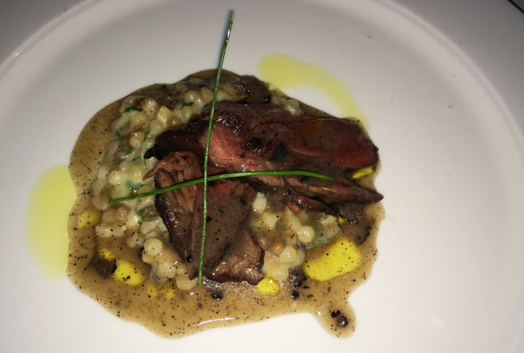 Grilled Hanger steak with Celery root Fregula and black truffle Vinaigrette