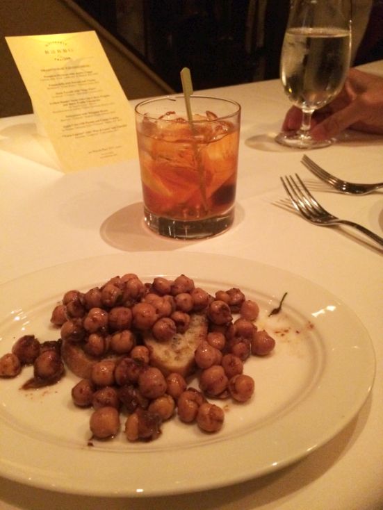An amuse-bouche of Crostini di Ceci, whole chickpeas tossed with black olive tapenade. The very tender, slightly spicy chickpeas were drenched with balsamic vinegar and spooned over thick toasted bread. |