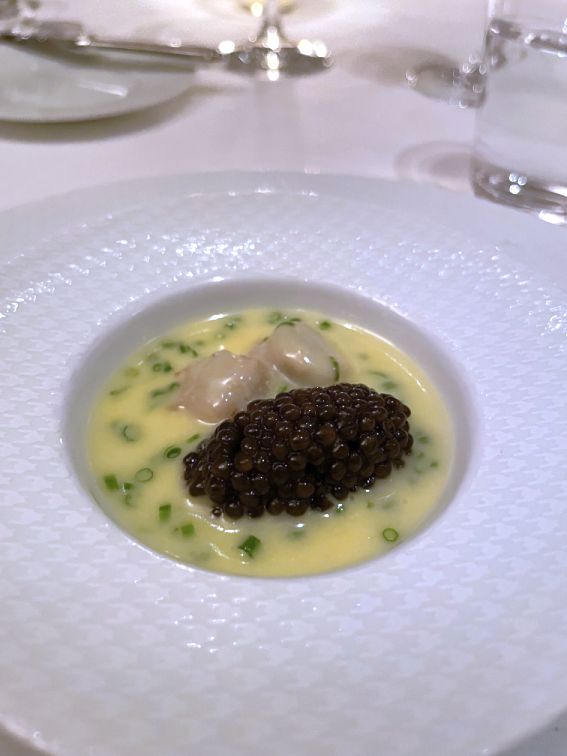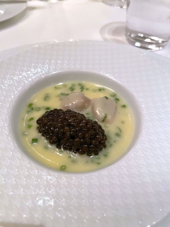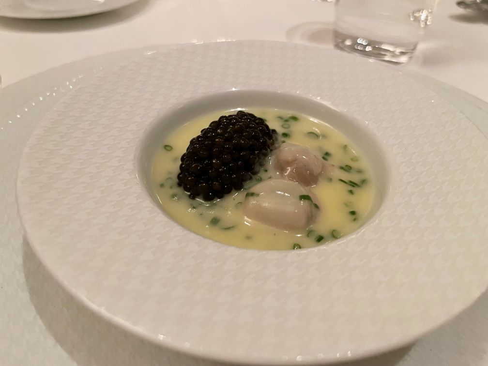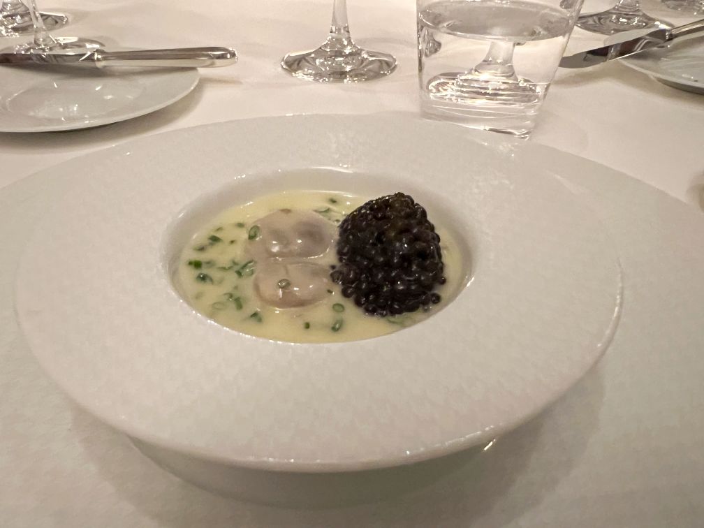 On the plate is two plump oysters floating of top of a bed of tapioca custard and garnish with a generous quenelle of caviar.
