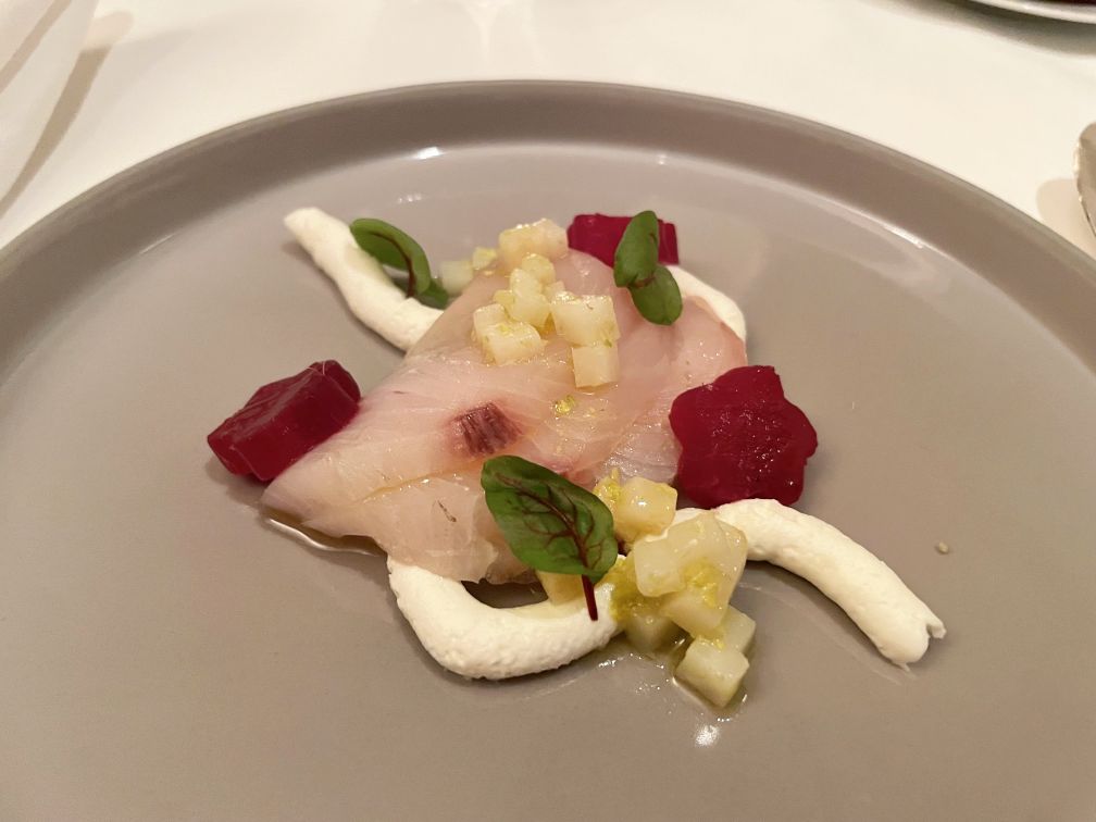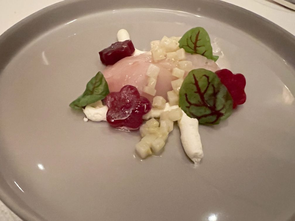 Here is paired with the sweetness of the roasted baby beets, the acidity/saltiness/sweetness of celery root relish, the creaminess and a bust of flavor from the horseradish crème fresh.