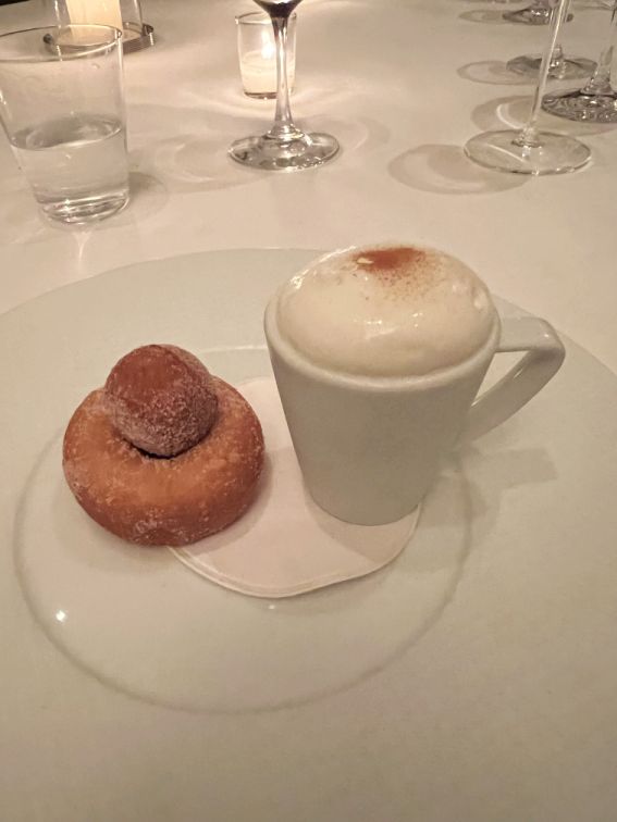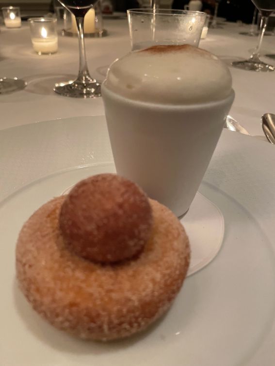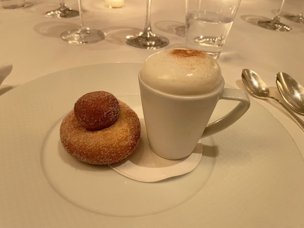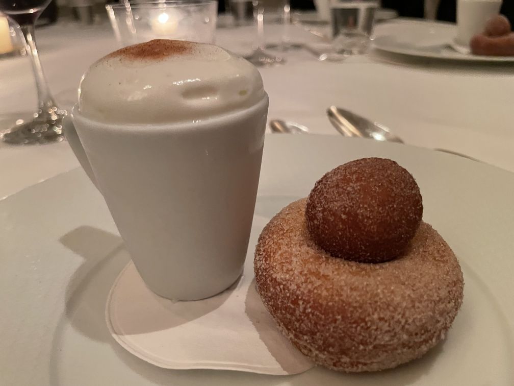 An element of surprise here is that the semifreddo, a partially frozen mousse, is cold beneath hot, frothy steamed milk. The donughts are delicious traditionally deep fried treats, coated with cinnamon sugar.