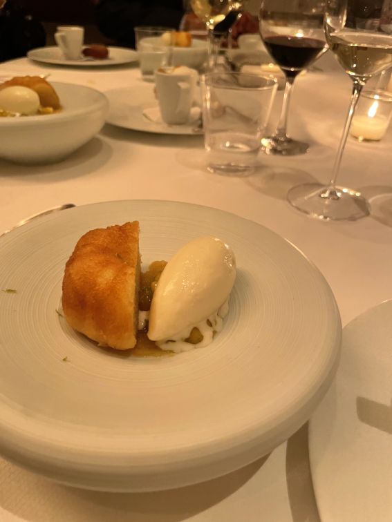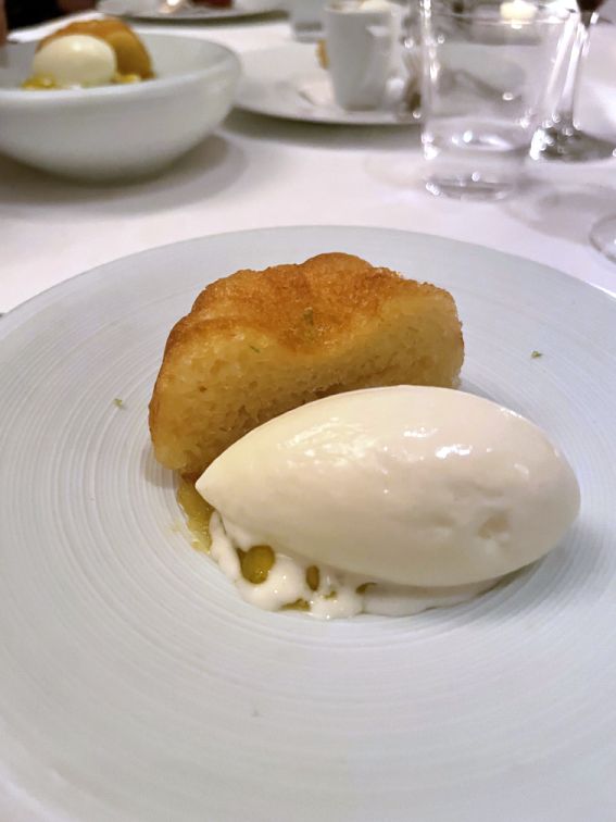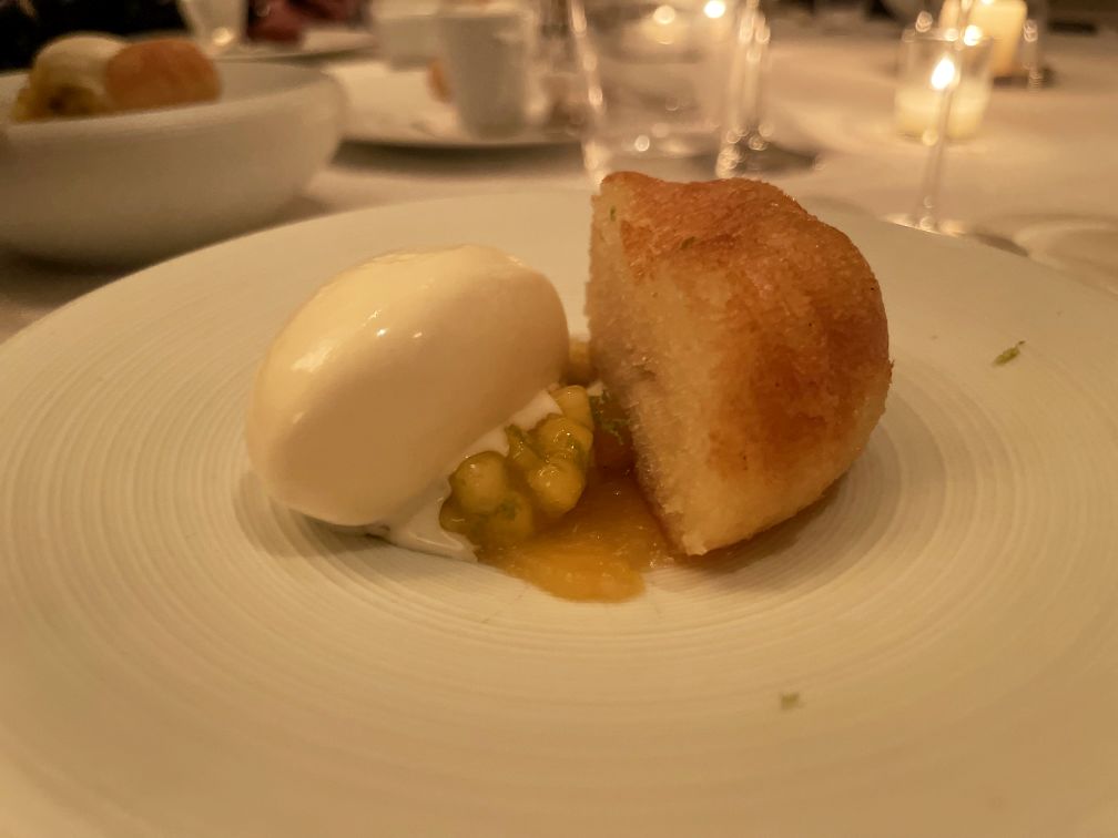 Our first dessert of the evening is a rum soaked brioche served with a quenelle of coconut ice cream on a bed of passion fruit.