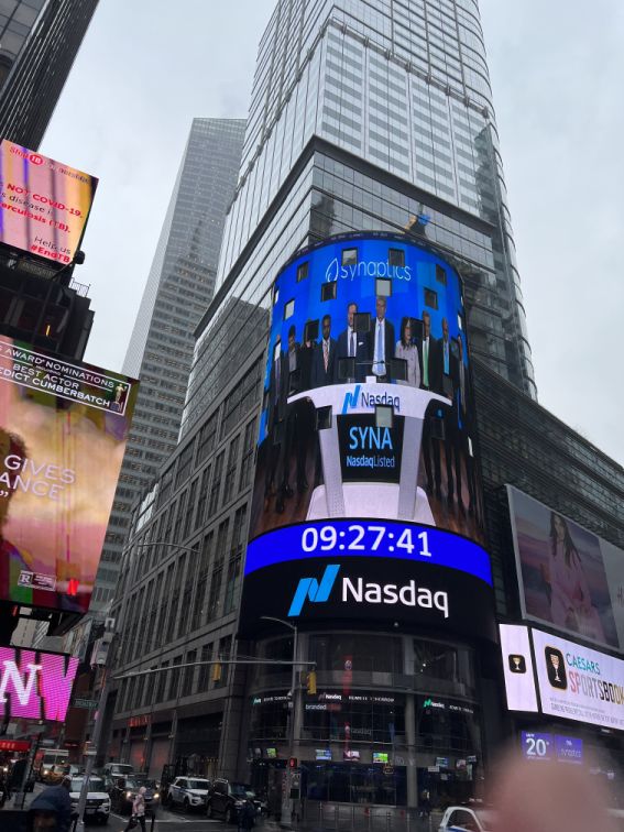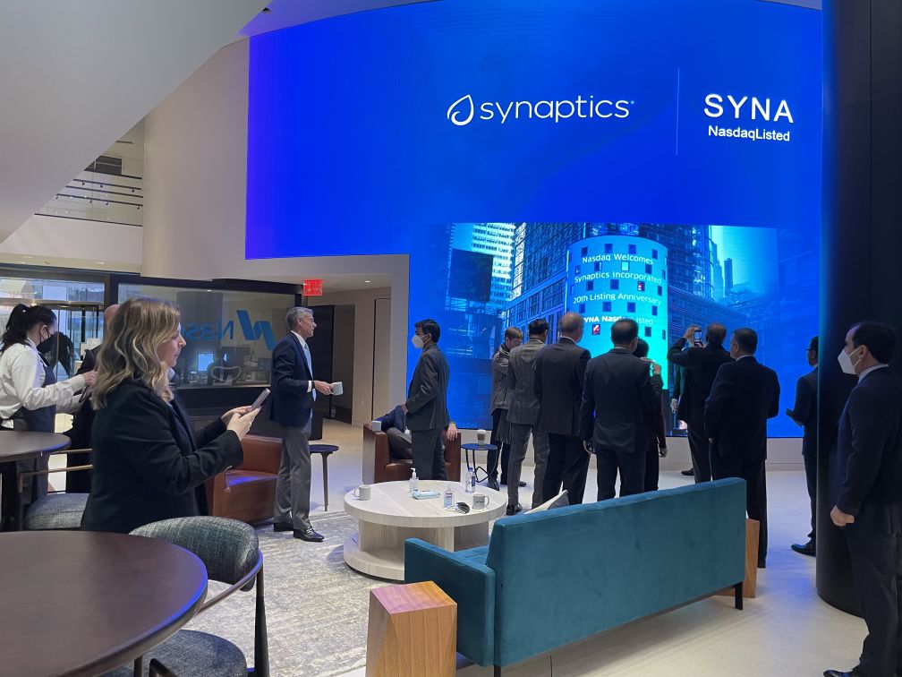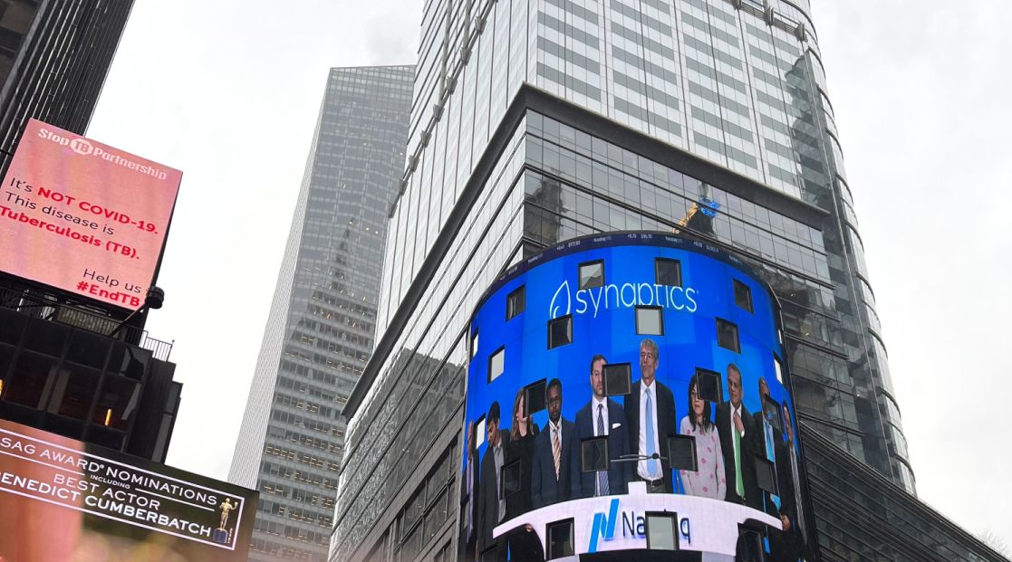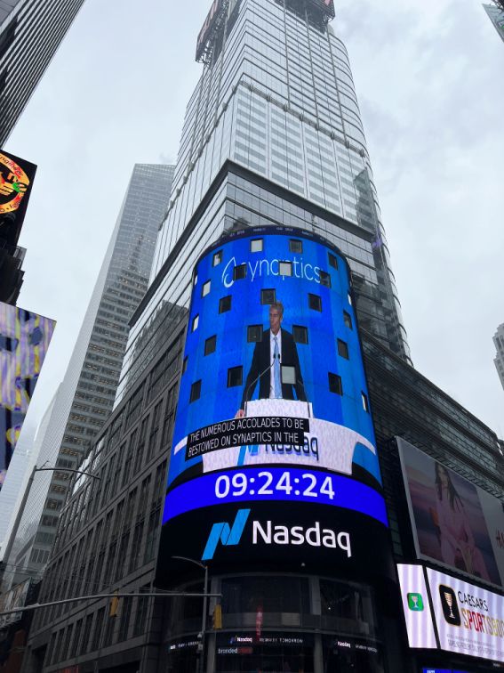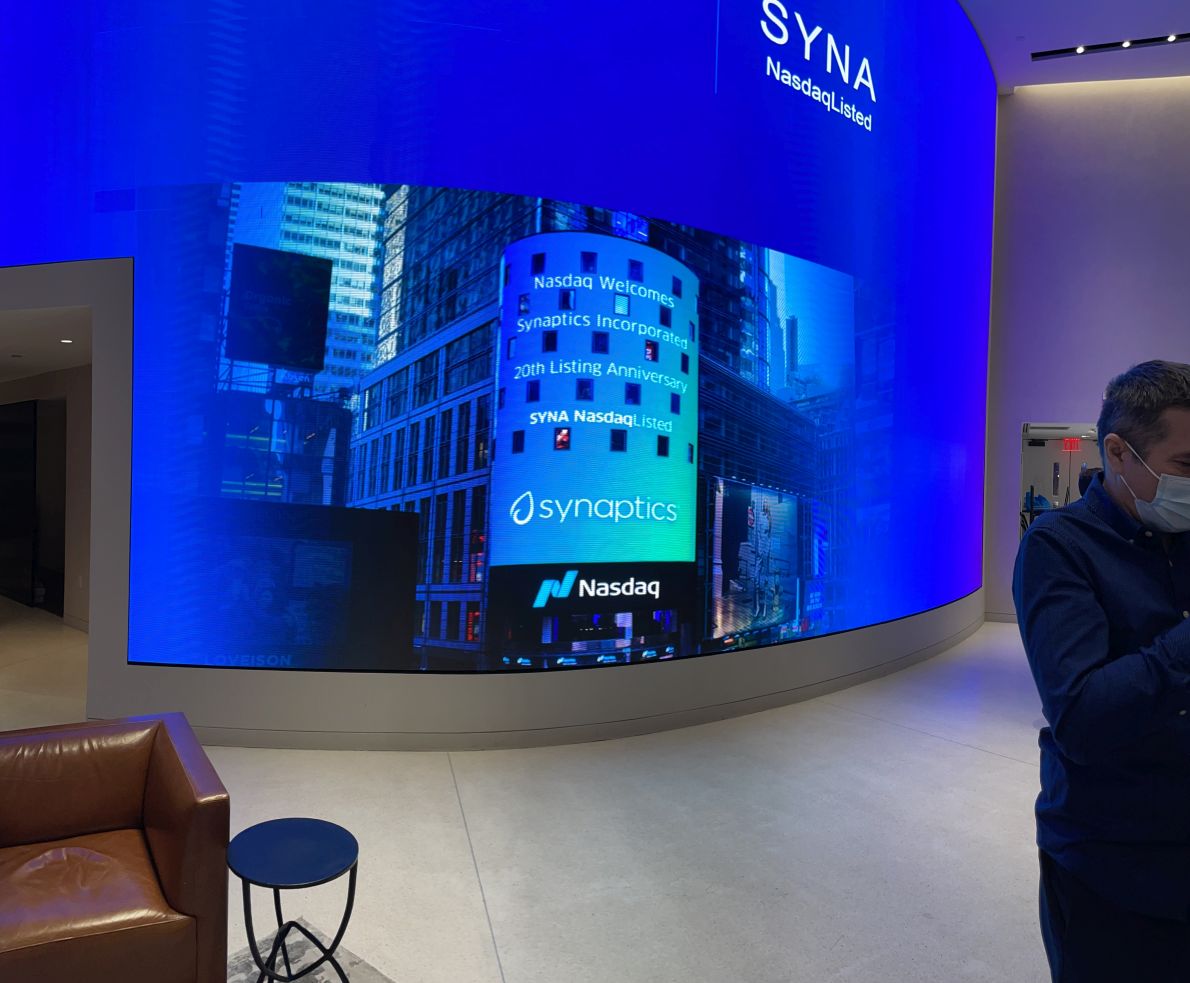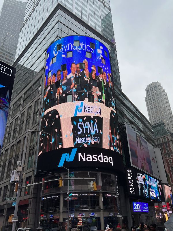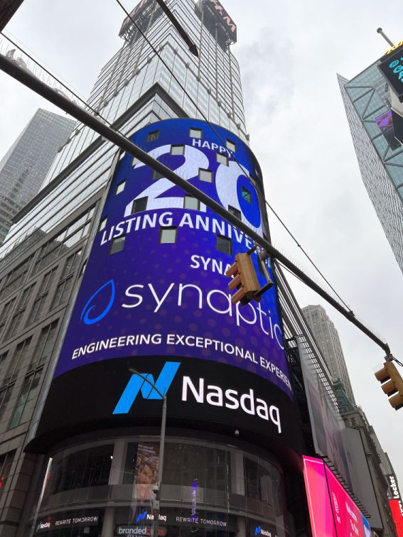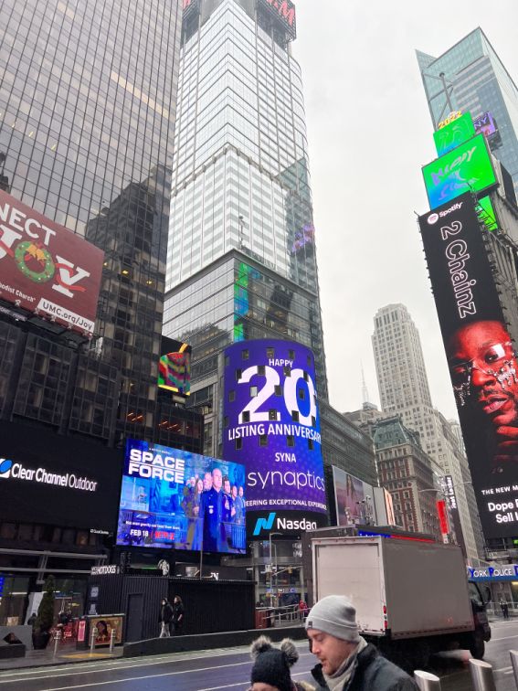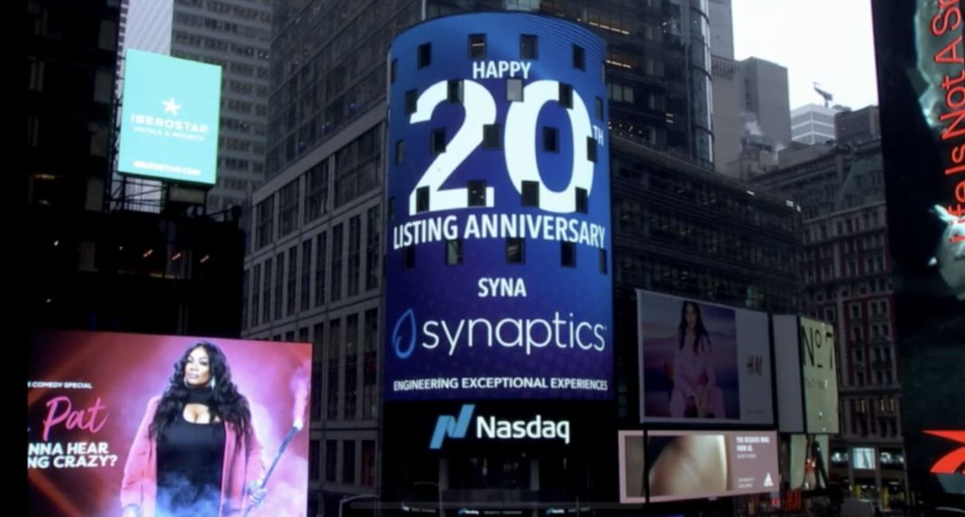 Giant billboard on Time Square with Synaptics logo celebrating the 20th listing anniversary with Nasdaq.