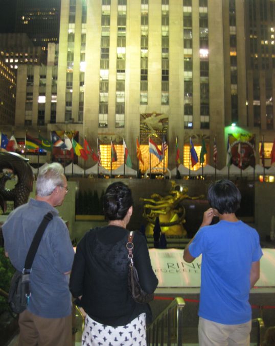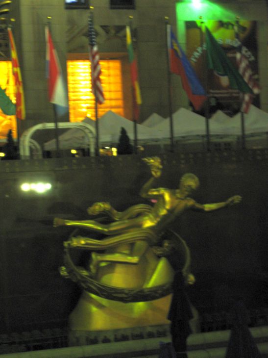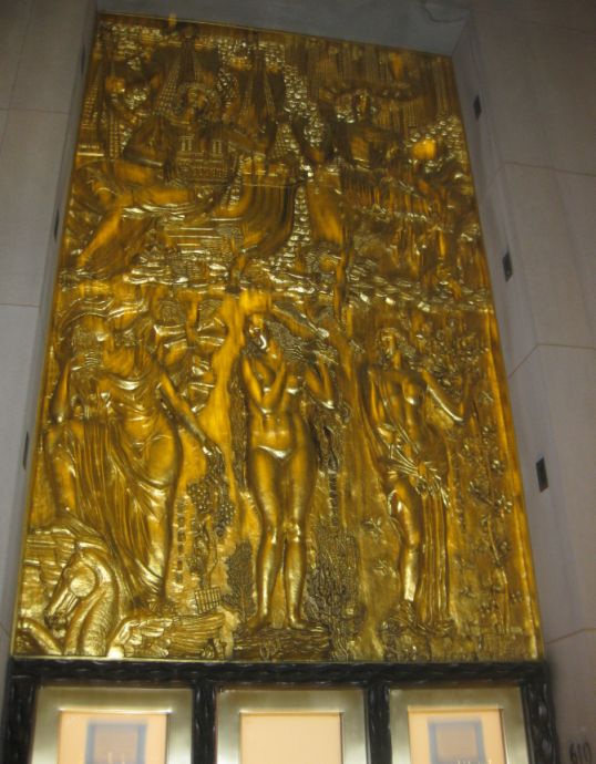 18 foot high, 8 ton statue of Prometheus overlooks the sunken plaza of Rockefeller Center. According to Greek mythology, Prometheus was a Titan who defied the will of Zeus and brought fire to Earth, helping mortals while risking harsh retribution from the authorities. The mountain-like-pedestal at the base of the statue symbolizes the earth, while the circle containing the signs of the zodiac represents the heavens. |