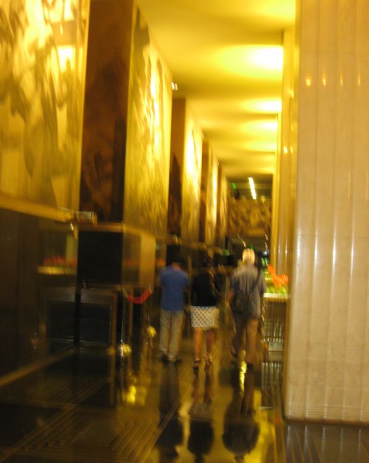Stunning, large mural by the Spanish Catalan artist Josep Maria Sert, titled American Progress, depicting a vast allegorical scene of men constructing modern America. It contains the figures of Abraham Lincoln, Mahatma Gandhi and Ralph Waldo Emerson, and it is wrapped around the west wall of the Grand Lobby at 30 Rock.