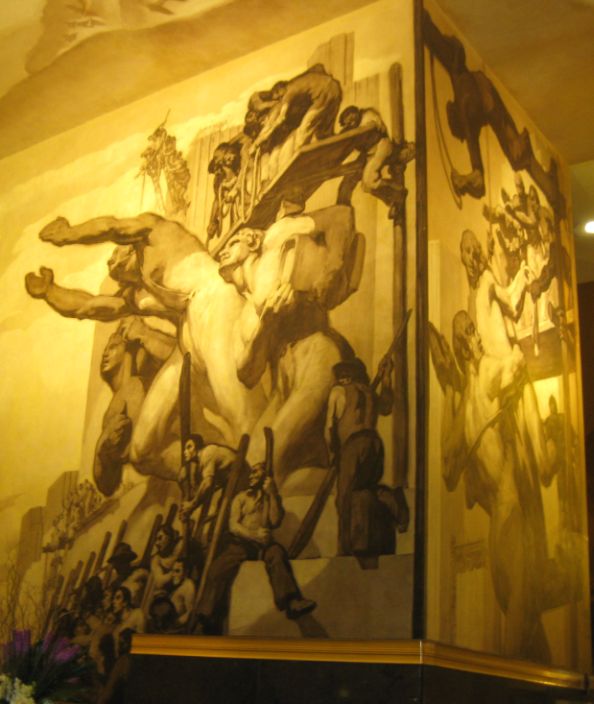 The lobby's original mural, designed and painted by Diego Rivera and depicting Lenin as a worker’s leader, was too controversial and replaced.