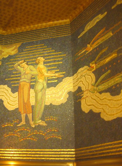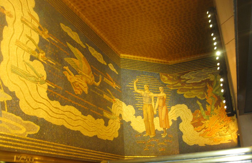 The mosaic mural in the loggia above the entrance at 1250 Avenue of the Americas was designed in 1932 by Barry Faulkner.