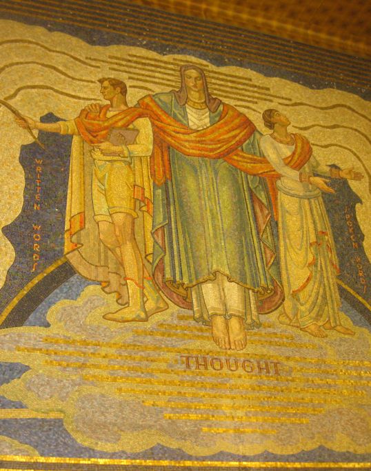 'Thought' is the central figure. The other two figures are messengers. The male figure represents writing, and the female represents the spoken word. All the figures are bound together by a scarf. Red and gold radio waves surround them and disseminate their message. |