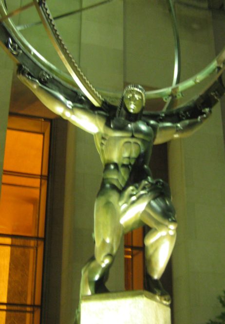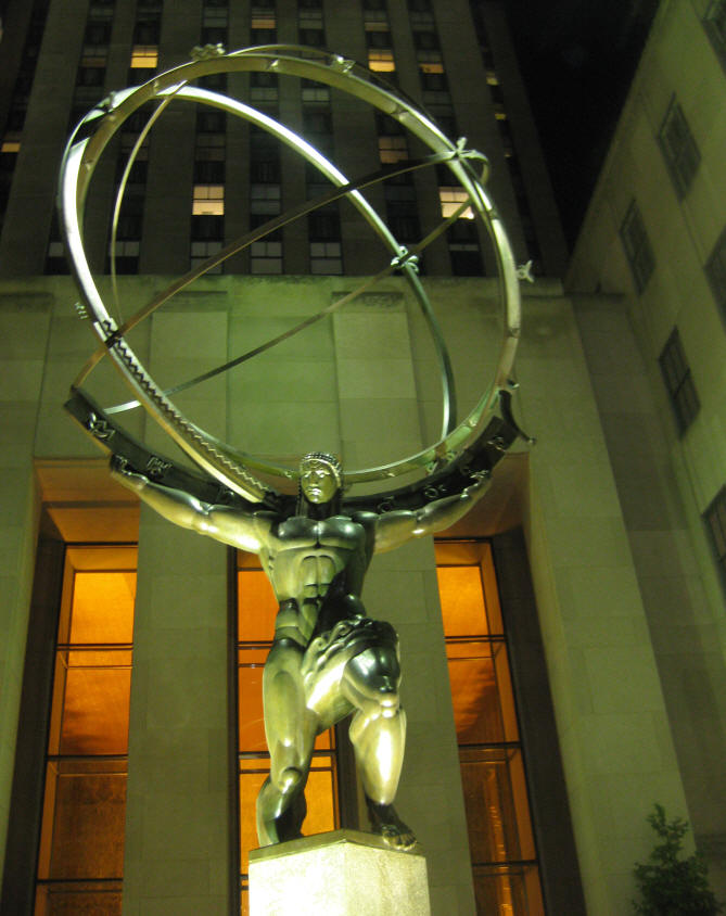 Atlas is a bronze statue in front of Rockefeller Center in midtown Manhattan, across Fifth Avenue from St. Patrick's Cathedral. The sculpture depicts the Ancient Greek Titan Atlas holding the heavens. It was created by sculptor Lee Lawrie and it was installed in 1937.