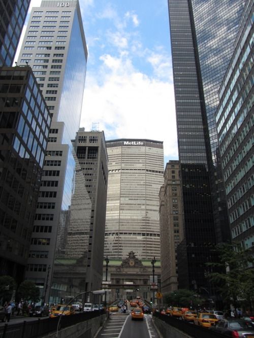 View of the entrance of Grand Central afar with the MetLife Building in the background. MetLife building was the largest commercial office building in the world when it opened on March 7, 1963. It is a recognizable part of the Manhattan skyline and one of the fifty tallest buildings in the United States. It faced huge unpopularity when it was first built, and was described as an 'ugly behemoth', due to its lack of proportion and huge scale. and made Grand Central looks like a dwarf next to it. |