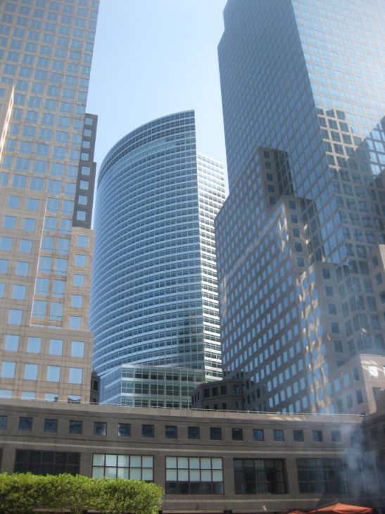 The rear of the building opens onto the World Financial Center Plaza and the North Cove Yacht Harbor on the Hudson River.