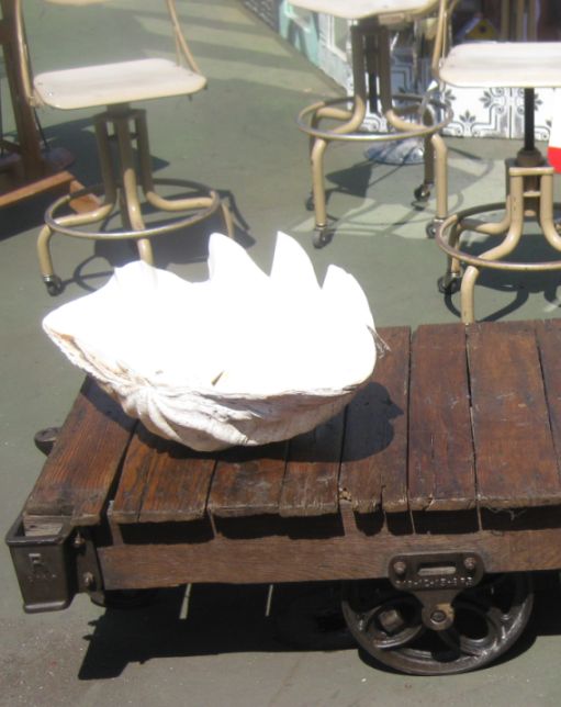 This is a huge shell on an antique wooden cart. |
