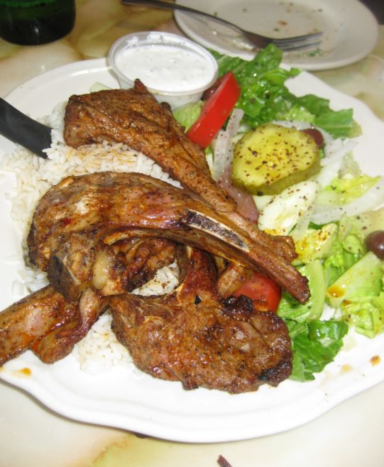 Lamb chops marinated baby lamb chops, grilled to perfection, served with rice, green salad, and yogurt sauce