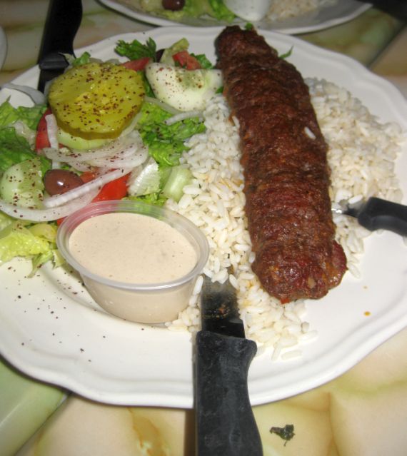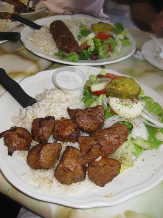 Beef Kabob served with rice, green salad, and yogurt sauce |