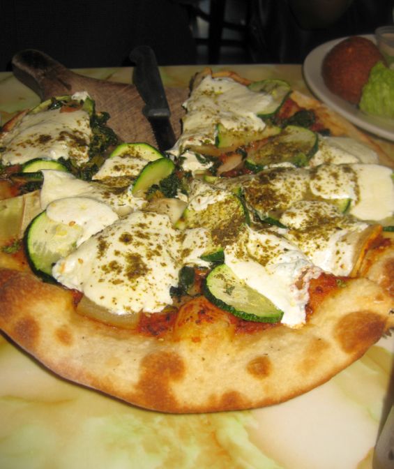 Black Iris Individual 10 Inch Pitzas (pizza) with grilled eggplant, zucchini, spinach, fresh mozzarella and herbs