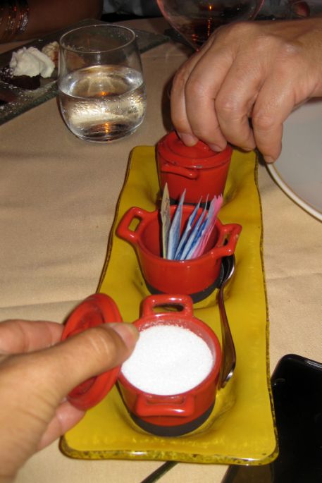 Cute containers with different types of sugar for our coffee. |