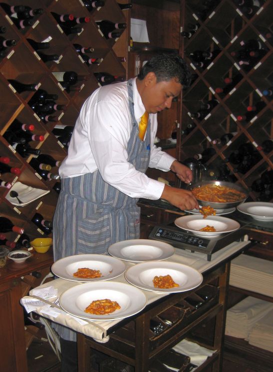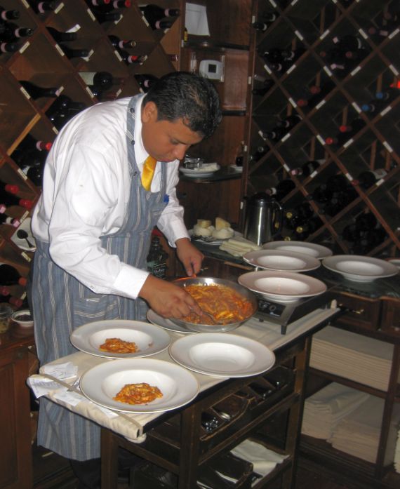 The Cavetelli with Calabrase Andouille is brought out from the kitchen in a large skillet. They have a small portable cart where the waiter is laying out 8 plates (for our table) and then proceed to spoon in the food. Most of the food are plated in the main dining table so everyone can see.