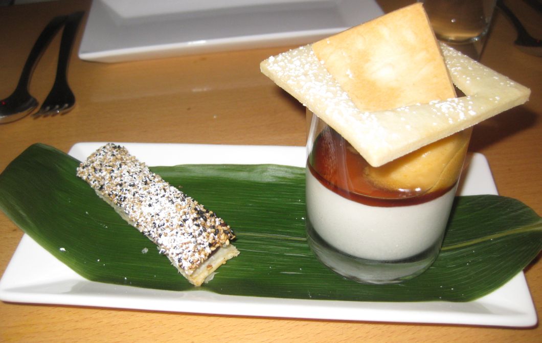 Tofu Cheesecake with coffee infused maple syrup served with butter cookie and on the side is a red bean pastry sprinkled with black and white sesame seeds and a dash of powdered sugar.