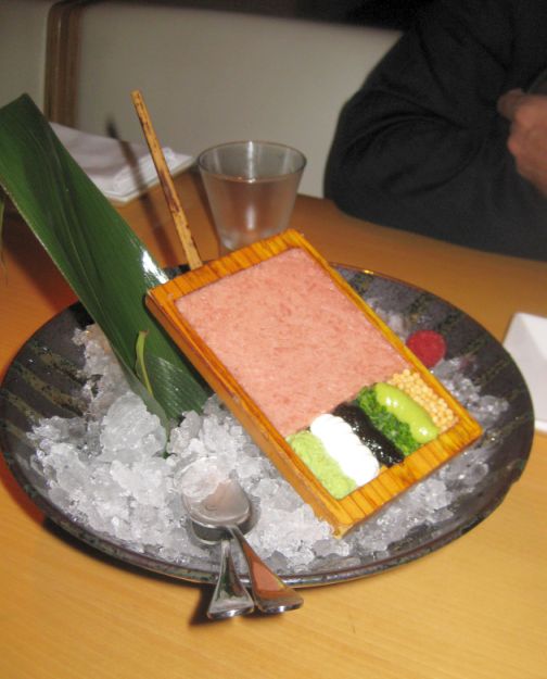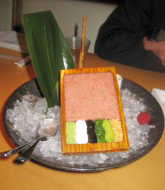 The dish came in a giant bowl filled with ice and on top of the bowl is a wooden box filled with Toro tartare and served with 6 different garnishes" nori paste, wasabi, sour cream, chives, guacamole and rice cracker and a little cup of Dashi soy on the side.