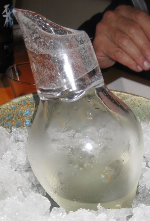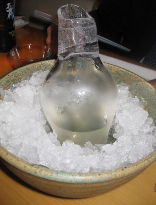 Sake was served on a large bowl filled with ice.