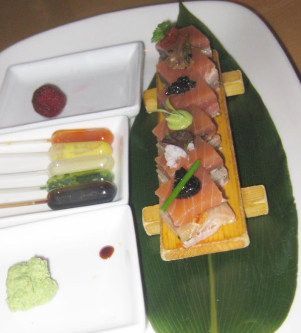 Morimoto Sashimi - Seared Toro, Salmon, Eel, Tuna, Hamachi served with five sauces in tiny little squeeze bottles.