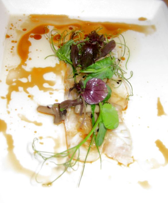 Whitefish Carpaccio (I think it was Fluke) tossed in a light soy-sauce based vinaigrette in hot oil and misuba leaf.