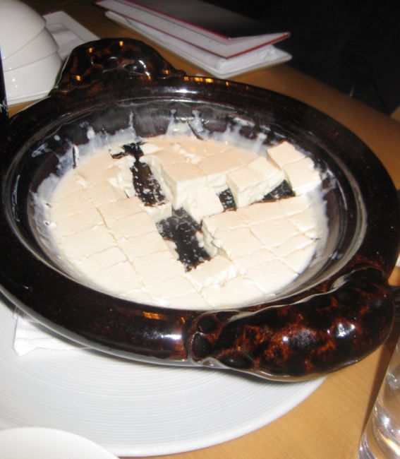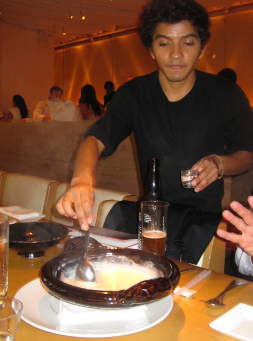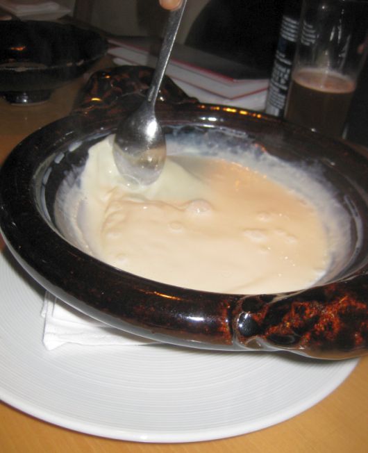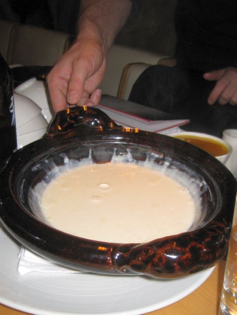 The waiter brought to the table a large clay pot with a lid. He opened the lid, stir the fresh soymilk (liquid) and then proceed to drizzle slowly in a dose of salt/magnesium mixture (you can see the waiter holding the little glass on his hand) which causes to soymilk to congeal into tofu. He closed the lid and told us to leave it there (no peeking into the pot) for about 7 to 10 minutes in order for the soymilk to be coagulated.