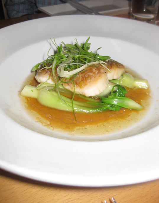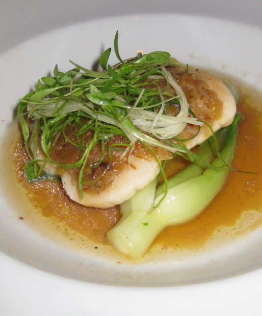Steamed scallop with Xo Jan on a bed of steamed baby Bok-choy and shredded Tokyo scallion.