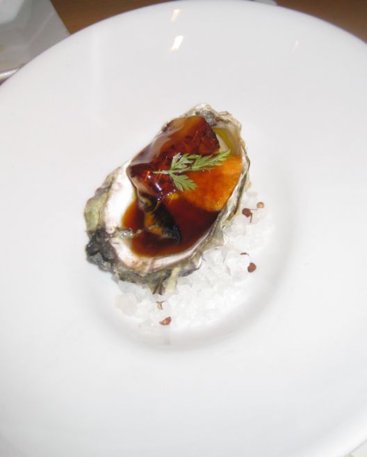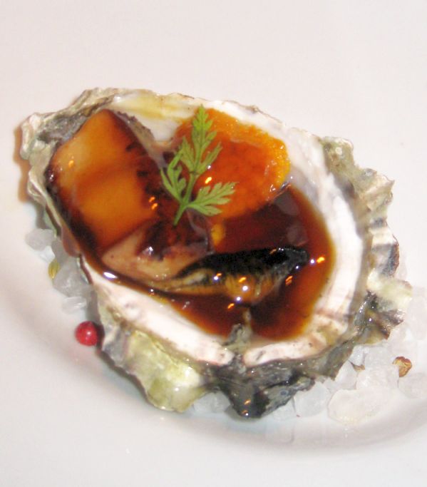 Oyster Foie gras- lightly cooked oysters, foie gras, uni (sea urchin), in a teriyaki sauce - This is from the Omakase menu that's why there is only 1 oyster per dish.
