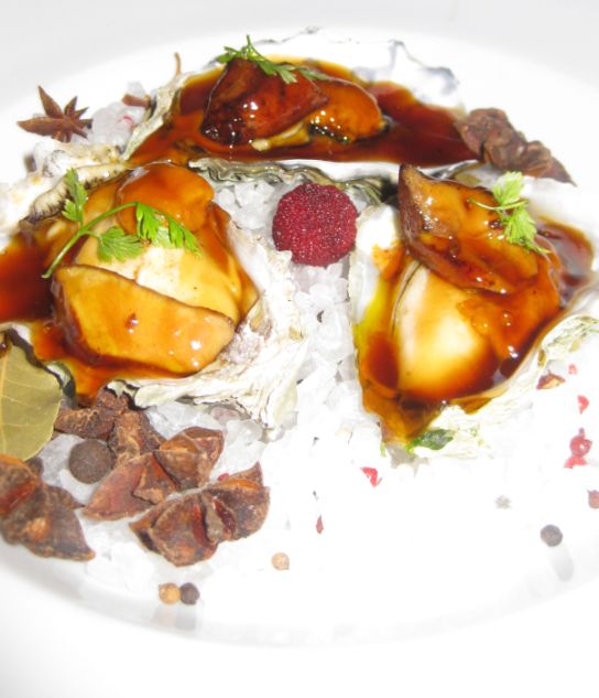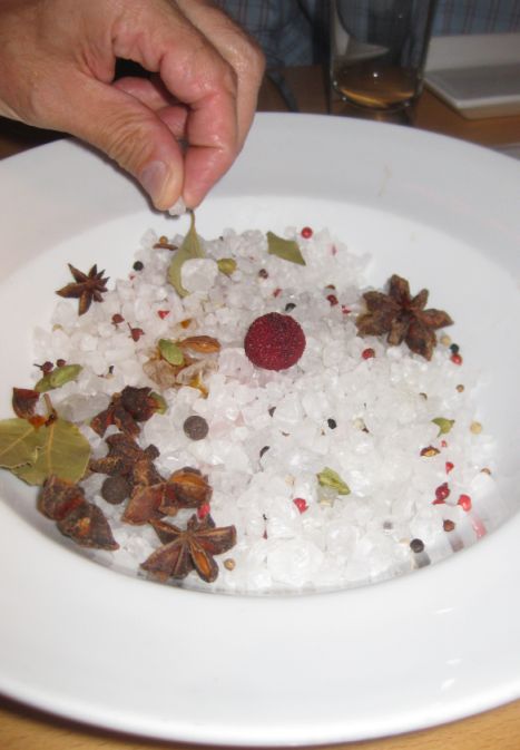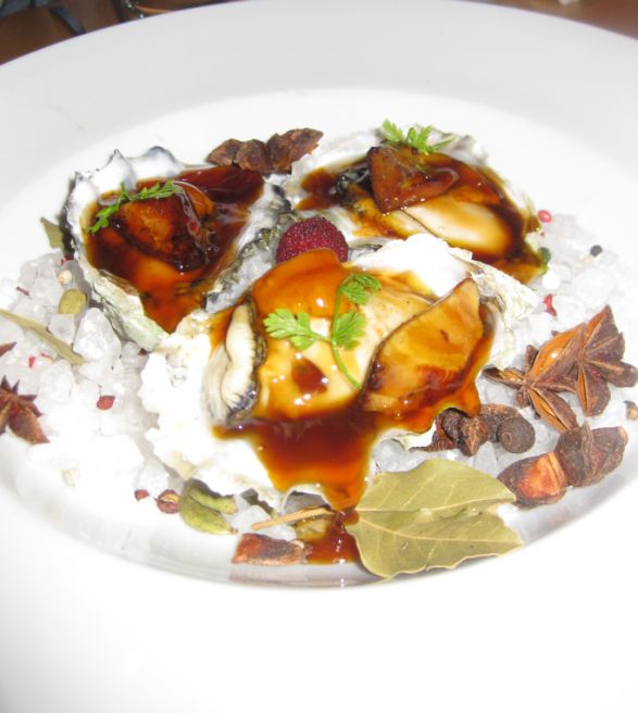 Oysters are gone and what was left was the plate that the oysters came with. The plate was beautiful filled with a bed of rock salt, star anise, red and black peppercorn, bay leaves, etc...