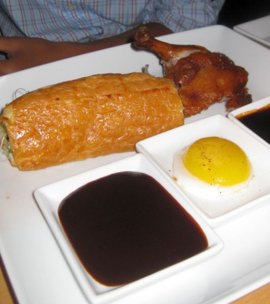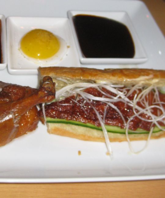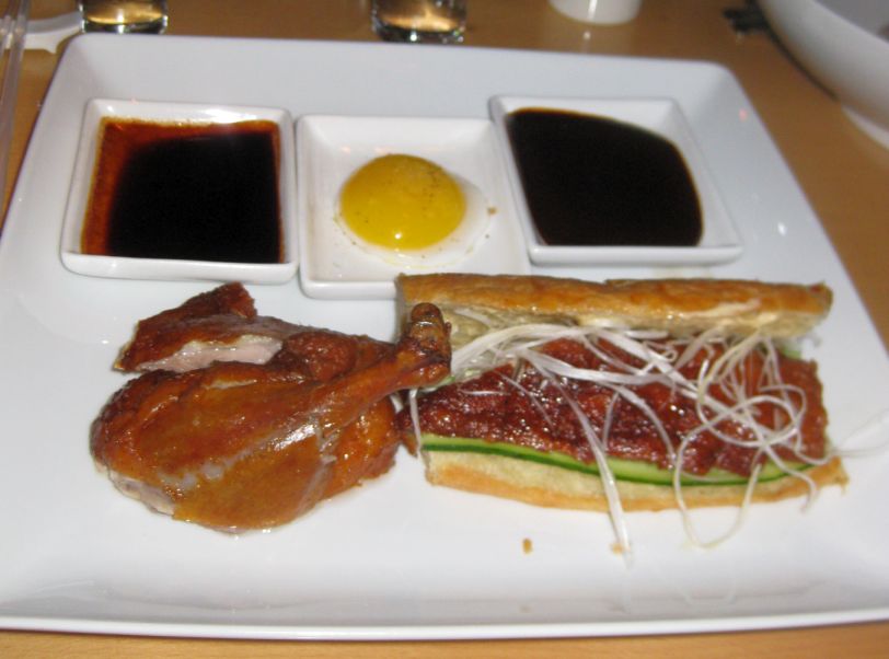 This dish is inspired by the wonders of Peking duck, composed of a single duck leg cooked in the classic Peking style, a duck egg, and a roast-duck sandwich made not with Chinese pancakes but with a croissant infused with foie gras. How can you go wrong with this combination?