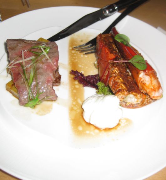 "Surf and Turf" - Wagyu filet with pan sautéed lobster épicé with Garam Masala, and served with lemon crème fraîche.