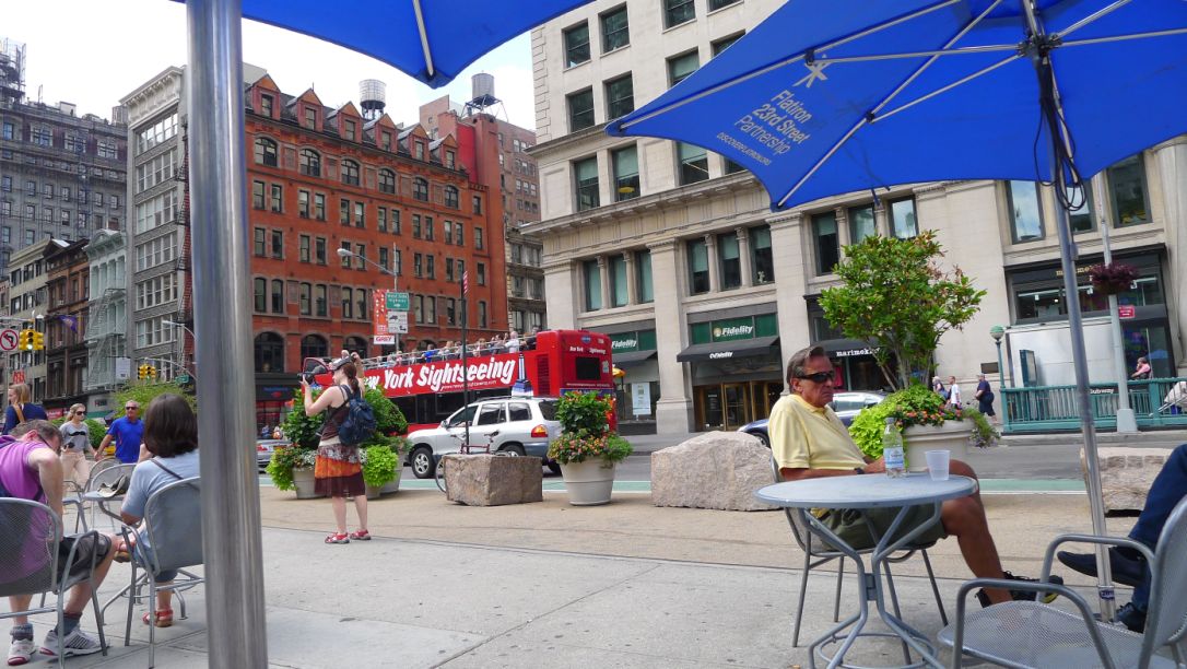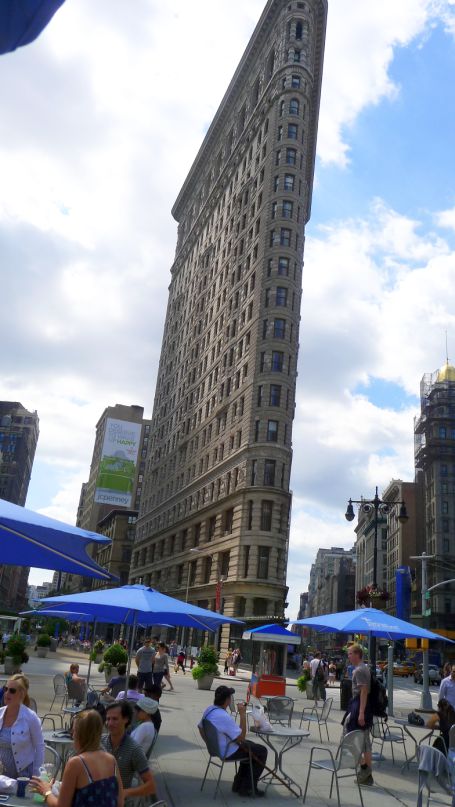 You can see a red New York sight seeing bus full of tourists on the upper deck and of course everyone is taking a picture of the Flatiron building.