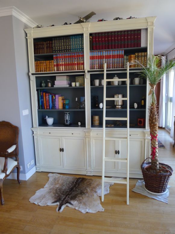 Bookshelf also serving as wall divider between the living room and the study. In the back is the study. |