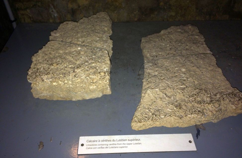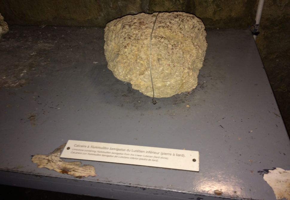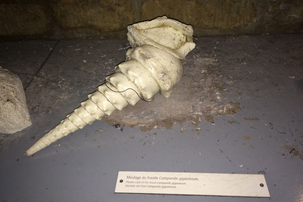 Plaster cast of Campanile giganteum, an exceptionally large marine gastropod from the Eocene epoch of the Paris Basin, was on display within the Catacombs